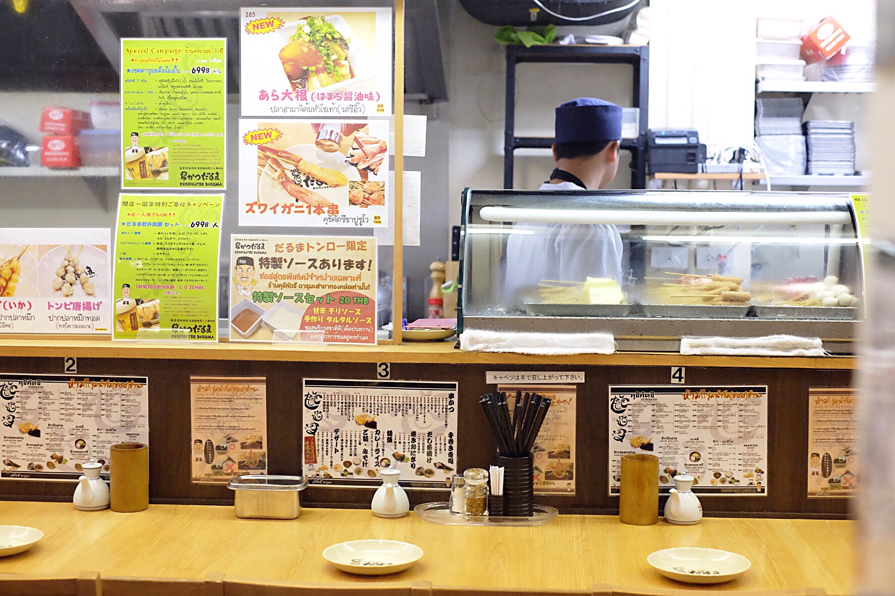 เราลงรถหน้าปากซอยเดินเข้ามานิดเดียวก็จะเจอโรงพยาบาลสัตว์ ซึ่งจะอยู่ติดกับร้าน ‘คุชิคัตสึ ดารุมะ’ เลย ร้านนั้นมองหาไม่ยากและจุดเด่นที่ทำให้มองหาได้ง่ายคือมาสคอตประจำร้านที่มีทั้งในสาขาที่โอซาก้าก็มาตั้งอยู่หน้าร้านด้วย คือมาสคอตรูปเชฟที่ทำหน้าตาจริงจังขึงขัง ยืนไคว่แขนถือคุชิคัตซึด้วย ซึ่งก็เป็นเอกลักษณ์ของทางร้านเลยหล่ะ